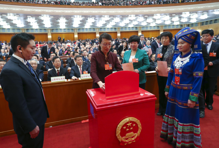 Lawmakers cast their ballots on an amendment to China's Constitution at the Third Plenary Meeting of the First Session of the 13th National People's Congress in Beijing on March 11 (CNSPHOTO)
