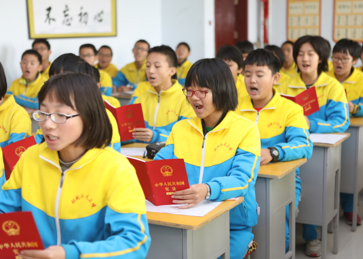 Students at the Zhi Zhen Experimental Middle School in the city of Hengshui, Hebei Province, read the Constitution on December 4, 2017 on China’s fourth Constitution Day (XINHUA)