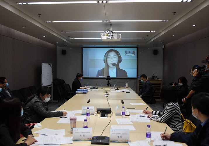 A job-hunter talks during an online interview for the campus recruitment held by the Beijing Organising Committee for the 2022 Olympic and Paralympic Winter Games in Beijing, capital of China, on April 29, 2020(XINHUA)