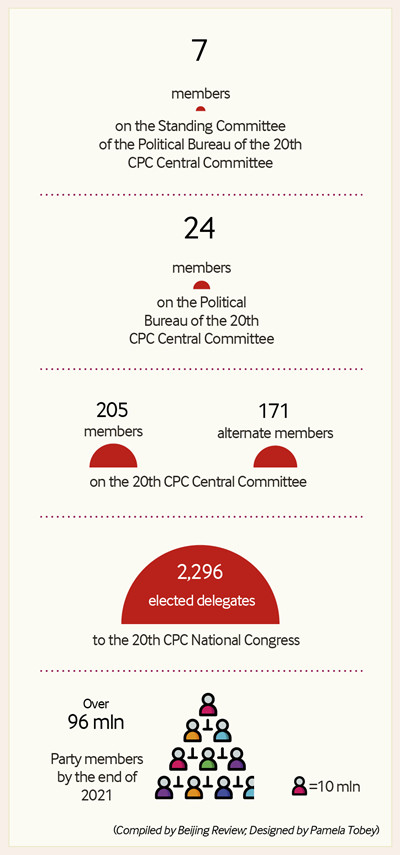 The 20th CPC National Congress concludes in Beijing on October 22 (XINHUA) Broad consensus On October 22, the new CPC Central Committee which has 205 members was elected during the closing session of the five-yearly national congress. According to the Party Constitution, the highest leading bodies of the Party are the National Congress and the Central Committee which it elects. Between plenary sessions of the Central Committee, the Political Bureau and its Standing Committee shall exercise the functions and powers of the Central Committee. At the October 23 plenum, the 24 members of the CPC Central Committee Political Bureau were elected; of these, seven were elected to the Standing Committee of the Political Bureau, the top leadership, which includes the general secretary. The plenum endorsed the members of the CPC Central Committee Secretariat and named the members of the CPC Central Military Commission. In addition, the 20th CPC National Congress elected the 133 members of the Central Commission for Discipline Inspection (CCDI), who then elected their own Standing Committee, secretary and deputy secretaries, who were then approved by the October 23 plenum. In early 2022, Xi began seeking advice from other members of the Standing Committee of the Political Bureau on candidates for a new central leadership, according to a Xinhua News Agency report. On March 24, a plan for the recommendation of candidates was adopted. According to the plan, candidates should be dedicated, impartial and upright, and emphasis should be placed on merit regardless of background, and on having both integrity and ability, with greater weight given to the former. One-on-one talks played a major role in the process. Starting from April, Xi talked to 30 senior leaders to seek their opinions. From April to July, other senior CPC leaders also sought advice from 318 senior officials and military officers. Consultations continued until late September when the proposal on the makeup of the new central authority was adopted. It was then submitted to the first plenary sessions of the 20th CPC Central Committee and the 20th CCDI. There are also strict procedures for the nomination and election of the CPC Central Committee and the CCDI members. Of the 222 that had been nominated as CPC Central Committee member candidates, 205 were elected. The world is watching how the new leadership body will steer China through tough challenges and chart a fresh course toward national rejuvenation.