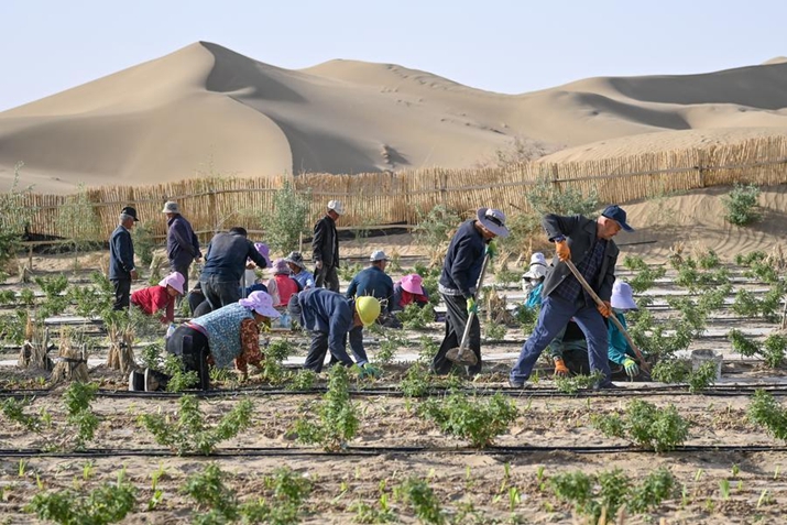 ![]() Villagers plant Belamcanda chinensis, a plant used in traditional Chinese medicine, at a garden in Yutian County, northwest China's Xinjiang Uygur Autonomous Region, on April 15. From medicinal plants to flourishing fruit orchards, these green barriers are not only curbing desertification of Taklimakan Desert but also invigorating local industries (XINHUA)