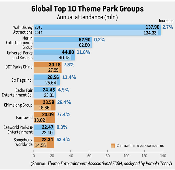 Pandas eat bamboo sprouts at the Chimelong Safari Park in Guangzhou, south China's Guangdong Province, on July 29, 2015 (XINHUA) A booming industry Amidst the transformation of the Chinese economy from one focused on investment to one which is consumption-based, tourism will embrace new growth opportunities as part of the service industry. Last year, over 4 billion trips were made domestically and China's tourism revenue exceeded 4 trillion yuan ($608 billion), both of which ranked the first worldwide, according to the country's National Tourism Administration. Thanks to the thriving tourism market, theme parks are presented with opportunities for expansion. China's first theme park was established in Shenzhen by the Overseas Chinese Town Group (OCT Group) in 1989. The number of theme parks had skyrocketed to about 2,500 by 2013, according to data from Forward Intelligence Co. Ltd. Major domestic theme parks have formed their own business models and characteristics. For instance, OCT Group combines theme parks with real estate, and Dalian Haichang Group focuses on displaying ocean animals. Wang's Wanda City also has a model combining tourism with commercial properties. It incorporates an outdoor theme park, an indoor shopping mall with restaurants and cinemas, the world's largest ocean park, hotels as well as a pub street. "Wanda is good at developing commercial properties. It invests in tourism with rent generated by commercial properties, while tourism draws visitors who promote the development of commerce. Tourism and commercial properties therefore reinforce each other's value in Wanda City," Wu told Beijing Review. Four domestic theme park groups—OCT Parks China, Chimelong Group, Fantawild and Songcheng Worldwide—have even ranked among the list of Top 10 Theme Park Groups Worldwide published by the 2015 TEA/AECOM Theme Index and Museum Index, an annual study of attendance at top theme parks, waterparks and museums. AECOM, a U.S.-headquartered multinational engineering firm that provides design, consulting, construction, and management services, predicted that China will overtake the United States to become the largest theme park market by 2020. By then, 221 million trips will be made to such establishments in China, almost doubling 2015's figure. According to a report published by Suzhou-based tourism service provider LY.com, over 80 percent of those surveyed rated theme parks as their top choice for family trips. "Theme parks which enable tourists to experience various facilities have followed the evolving trend of tourism, from sightseeing trips to interactive tours," Wu told Beijing Review. "Theme parks can satisfy an individual tourist's customized demands. For instance, some tourists prefer cartoon figures, while some like sea-creatures. Their needs can all be satisfied through a variety of parks," Wu added. However, the domestic theme park industry is currently plagued with over-construction, homogeneous competition and lack of cultural foundations. According to Forward Intelligence Co. Ltd., 70 percent of China's domestic theme parks are in the red, 20 percent are stable, and just 10 percent are profitable. Most domestic theme parks lack the large number of intellectual property (IP) rights possessed by Disney. In comparison, over 60 percent of the revenue of Disney's parks and resorts comes from by-products such as books, toys, food and clothes based on its IP. Ticket sales only account for a small proportion of Disney resorts' revenue. Although domestic theme park operators such as Fantawild have come up with their own cartoon characters and related by-products, they still lag behind Disney and Universal Studios in terms of the diversity and creativity of their products. Wei Xiang, an associate professor of the National Academy of Economic Strategy at the Chinese Academy of Social Sciences, said that the future of theme parks over the next five years will depend on their ability to develop by-products. Homogeneous competition is another problem. Many parks are amusement parks, such as OCT Group's Happy Valley parks and Chimelong Paradise. Although there are slight differences between these parks, their recreational facilities are more or less the same.