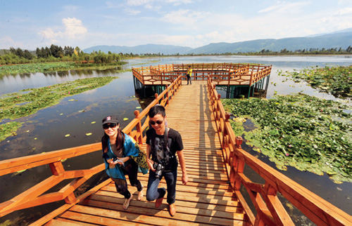 A REVIVED LAKE: Tourists visit a wetland park on Erhai Lake. Improved sewage management has had a dramatic effect on water quality (CFP)