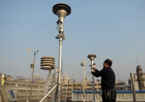 MONITORING THE AIR: A technician checks an air-monitoring device at a station in Lanzhou of Gansu Province. The city regularly releases air-quality statistics to the public (NIE JIANJIANG)