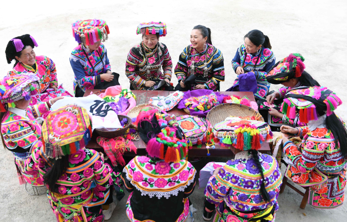 Women from the Yi ethnic group discuss their traditional embroidery craft on March 25 in a village located in Chuxiong Yi Autonomous Prefecture, southwest China's Yunnan Province (XINHUA)