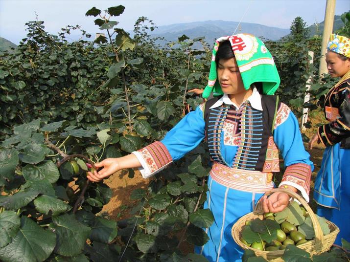 ![]() Women of the Bouyei ethnic group pick kiwifruits at an Miluo Township orchard in Liupanshui City on September 10 (COURTESY PHOTO)