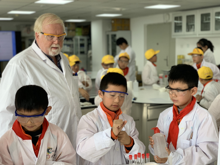 ![]() David Evans gives chemistry experiment instructions to students at a primary school in Beijing on October 26, 2019 (COURTESY PHOTO)