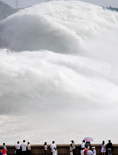 GUSHING OUT: People admire the spectacular water scene at Xiaolangdi Reservoir on the Yellow River during the reservoir's 10th sand-washing sluicing operation on June 22. The action is to clear up a sediment-laden section of the Yellow River in Jiyuan, Henan Province (MIAO QIUNAO) |