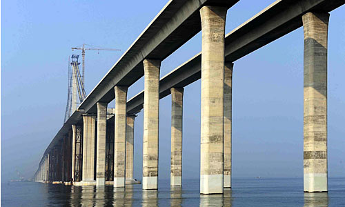 The 41.58-km-long bridge across Jiaozhou Bay in Qingdao of Shandong Province is expected to be completed at the end of 2010 (LI ZIHENG)
