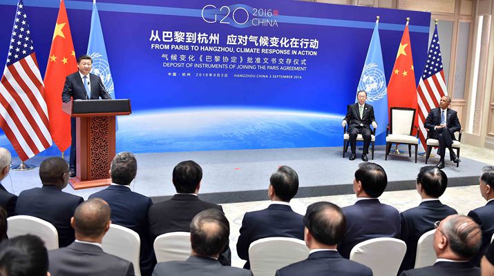 Chinese President Xi Jinping speaks at a ceremony to hand over the Paris agreement document ratified by China to the UN in Hangzhou on September 3, in the presence of UN Secretary General Ban Ki-moon and U.S. President Barack Obama (XINHUA)