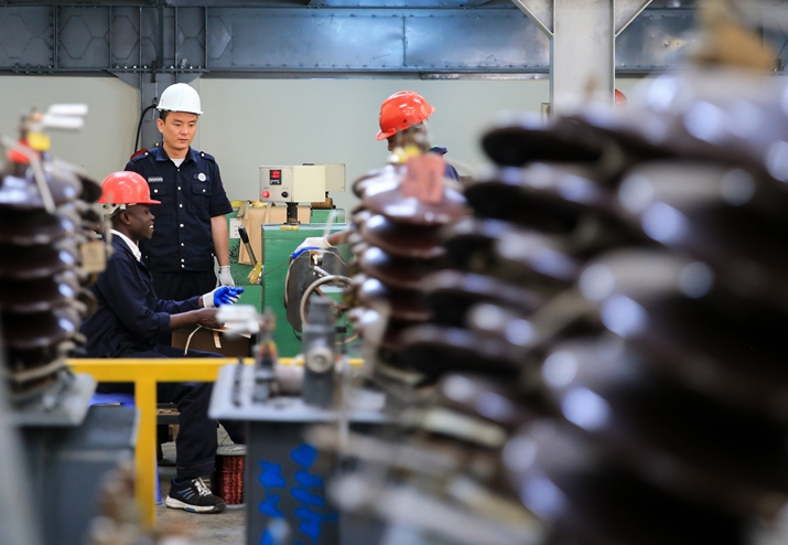 A Chinese engineer instructs local workers in operating a production line in a China-funded transformer factory in Kenya on October 5, 2016 (XINHUA)