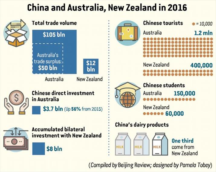 Besides their geographic proximity and status as developed Western nations, the Oceanian states of Australia and New Zealand are largely synchronized in their stance over relations with their Asian neighbor—China. This is attributable in some respects to the similar economic and social structures of the two countries, as well as their shared history as former British colonies. Both Australia and New Zealand are sparsely populated, export-oriented economies with rich natural resources, hi-tech industries, and well-developed agriculture and animal husbandry. China, in the meantime, is the largest trading partner of both nations. At the end of March, Canberra and Wellington, respectively, hosted Chinese Premier Li Keqiang. These visits are important not merely because they were the first of their kind in 11 years, but also because they took place at a time when the United States is appearing to pursue a policy of isolationism since Donald Trump took office. Trump has advocated an "America First" approach, stating his intention to renegotiate the North American Free Trade Agreement with Mexico and Canada, while the 12-year-old U.S.-Australia free trade deal could also be reviewed. Immediately after taking power in January, the new U.S. president pulled his country out of the Trans-Pacific Partnership (TPP)—the largest proposed free trade deal in history—effectively killing the accord in its current form. Trump's moves have worried U.S. traditional allies, most of which are long-time beneficiaries of liberal trade. At the same time, China has signaled its willingness to play a bigger role in promoting global free trade. When addressing the annual meeting of the World Economic Forum in Switzerland this January, Chinese President Xi Jinping delivered a robust defense of globalization and underlined China's firm stance on promoting trade and investment liberalization. Australia might expect China to assume such a role. After the U.S. pulled out of the TPP, it was reported that Australia floated the possibility of inviting China to join the initiative, despite some suggestions that the TPP was initially promoted by Washington to counter China's growing economic influence in the Asia-Pacific region. China is offering clear alternatives in the wake of the stalling free trade mechanisms and the emergence of protectionism. When meeting Australian officials in Canberra, the Chinese premier also reiterated China's firm support of free trade, stating, "We believe that to resolve trade imbalance we need to continue to expand trade. That is the solution. We cannot close our doors." Turnbull echoed Li, saying that protectionism is "not a ladder to get out of the low-growth trap," but "a shovel to dig it deeper." Pushing free trade forward During China's Two Sessions, which were held in early March reviewing government work and pointing out future tasks, the Australian Financial Review published an article, Why China's Work Report Is More Important Than Australia's Federal Budget, indicating that China's economic stability matters a lot to Australians' wallets. Despite China being far away from Australia and New Zealand, their economic ties are remarkably close. This builds a robust foundation for the continuous growth of China-Australia and China-New Zealand relations.
