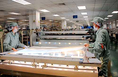 SOLAR GIANT: A solar panel production line in Wuxi-based Suntech Power Holdings Co. Ltd. in Jiangsu Province. Suntech Power in control of 14 patents became one the world's top 10 solar panel producers in 2004 (SUN LIN) |