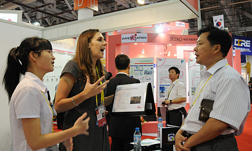 GLOBAL MIXER: Li Haoqing (right), Chairman of Jiangxi Yifu Industry Co. Ltd., talks with a U.S. businesswoman. The CIFIT provided a platform for Chinese firms searching for opportunities to expand overseas (ZHANG CHENCEN) |