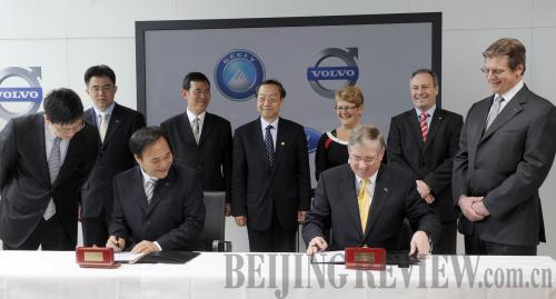 SEAL THE DEAL: Li Shufu, Chairman of China's Geely Holding Group (left), and Lewis Booth, Chief Financial Officer of Ford Motor Co., sign the agreement of Geely's purchase of Ford's Volvo division on March 28, 2010 (XINHUA) |