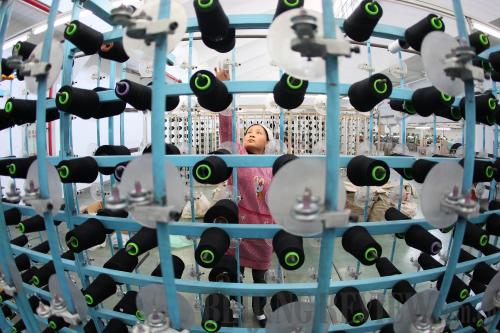 SPINDLES OF FORTUNE: An employee inspects machinery at Zhejiang Furun Textile Co. Ltd. Many private textile companies are trying to overcome the difficulties caused by higher cotton prices and labor costs (GUO BIN) |