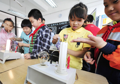 GREEN LIGHTS: Primary school students in Hangzhou, Zhejiang Province, compare the electricity consumption of energy-efficient bulbs and incandescent ones (LI ZHONG) |