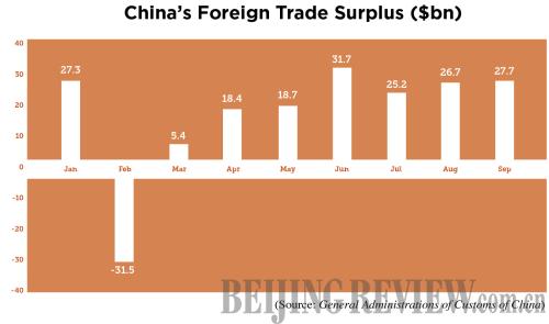 In September, China's trade surplus rose slightly to $27.67 billion from $26.66 billion in August, the GAC said.