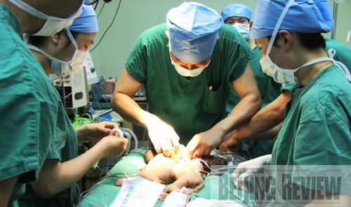 LIFE SAVERS: Doctors at a hospital in Guangzhou, Guangdong Province, operate on Siamese twins in an attempt to separate them on March 10 (ZHOU WENJIE) |