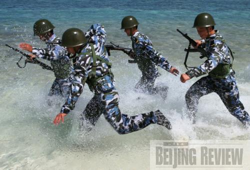 READY TO FIGHT: Chinese marines stationed in South China Sea's Xisha Islands perform a drill in 2005 (CHEN YAN) | As a result of the country's first Five-Year Plan from 1953 to 1957, China spent an enormous amount of money importing aircraft, coastal artillery batteries and combat ships including destroyers, submarines and torpedo boats. The country also imported technologies and materials to build modern frigates in the mid-1950s.