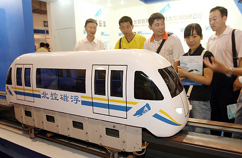 MAGLEV MANIA: Visitors watch a high-speed maglev train model of the Beijing Enterprises Holdings Maglev Technology Development Co. Ltd. at the China (Beijing) International Transport and Municipal Facilities Exhibition in August 2009 (XINHUA) |
