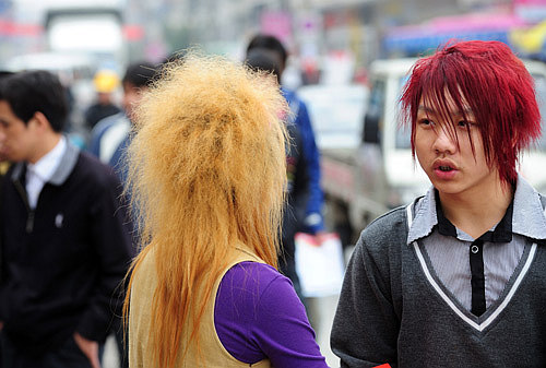 MODERN LIFE: Two young migrant workers with distinctive hairstyles look for work at a job market in Jinjiang, Fujian Province, on March 3 (JIANG KEHONG) |