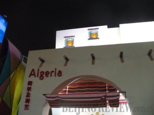 The Algeria Pavilion invites visitors to experience nightfall in the historic Casbah. The narrow "streets" lead visitors up to a theater with a time-lapse film of a single day in the capital Algiers. Downstairs, there is a display on Algeria's national parks and samples of 16 different colors of sand from a single quarry.