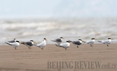 FIGHTING EXTINCTION: Fifteen Thalasseus zimmermanni, known as "legendary birds" for their rareness, are seen in the Minjiang River estuary wetland, Fujian Province, in May 2009. Scientists estimate there are less than 50 types of birds in the world (XINHUA) |