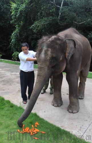 PACHYDERM PRESERVE: A keeper feeds an elephant carrots at the Xishuangbanna Asian Elephant Breeding Center in Yunnan Province (XINHUA) |