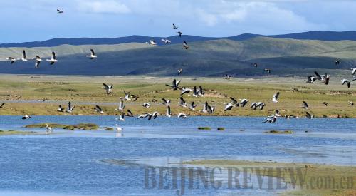 BEST HABITAT: Waterfowls take to the air in the Sanjiangyuan National Nature Reserve in Qinghai Province. The reserve is the origin of the Yangtze River, Yellow River and Lancang River (XINHUA) |