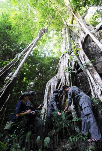 PROTECTING FORESTS: Working staff of the Xishuangbanna National Nature Reserve in Yunnan Province measure and record the growth condition of a Chinese banyan tree in the tropical rain forest there (XINHUA) |
