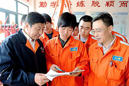 CARING FOR THEM: Chang Dechuan (left), President of Qingdao Port (Group) Company Ltd., reads an intern's training reviews at the company's training center in Qingdao, east China's Shandong Province, on February 24 (LI ZIHENG) |