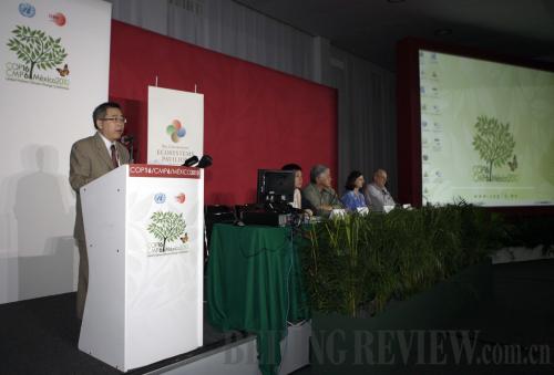 Su Wei (left), deputy director of the Chinese delegation to the summit, briefs China's policy and measures in fighting against climate change at the ongoing United Nations Climate Change Conference in Cancun on December 1 (XINHUA)