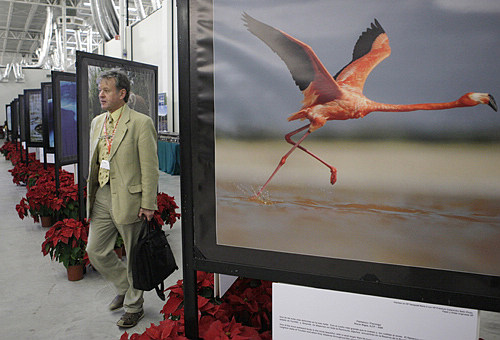 A man walks past a photo exhibition at the ongoing United Nations Framework Convention on Climate Change in the Mexican seaside resort of Cancun on December 1 (XINHUA) |