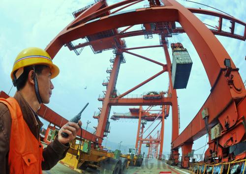 REAL STRENGTH: A worker guides a transportation crane at a container harbor in Fuzhou Port, Fujian Province. Economists call on China to take extra steps to avert financial risks and refocus on real economy (ZHANG GUOJUN) |