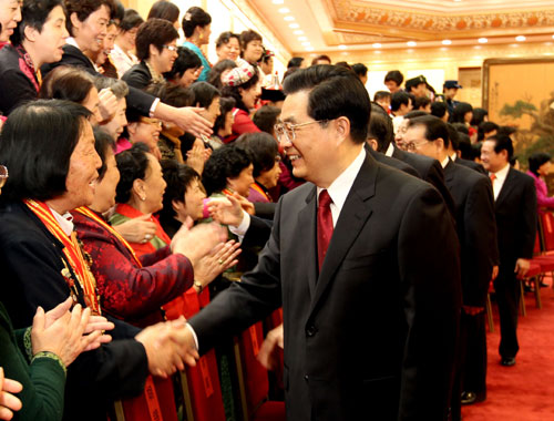 Addressing a gathering marking at the event the Great Hall of the People, Hu said Party committees and governments at all levels should resolutely carry out the basic state policy of equality between men and women, eliminate discrimination against women, and crack down on violations of women's rights in light with law.