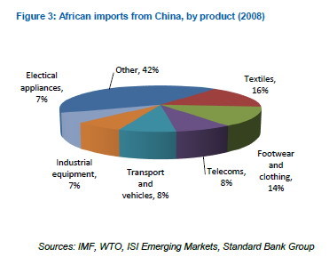 Low-cost consumer products flowing into Africa from China's coastal factories have grown rapidly in recent years. According to Trevor Manuel (2004), China's manufacturing expansion in an environment of low wages is a challenge for a host of African industries; Africa should find ways and means to engage with that reality. Electrical equipment; and nuclear reactors, boilers and machinery each account for 17percent of total African imports from China. Vehicles account for 8.5 percent of Africa's imports from China. In fact, China provides Africa with 10.2 percent of its vehicle imports. Both cotton and articles of iron and steel amount to above 6 percent of Africa's total imports from China, respectively. In fact, 10 percent of Africa's cotton imports come from China. Similarly, a large proportion of artificial filament (10 percent), ceramic product (9 percent) and glassware (5 percent) that is imported by Africa originated from China.