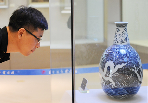 PRICELESS VASE: The museum of Lianyungang, Jiangsu Province exhibits a blue and white porcelain vase of the Ming Dynasty on July 11. It was sold for 224 million yuan ($35.12 million) at a recent auction (XINHUA) |
