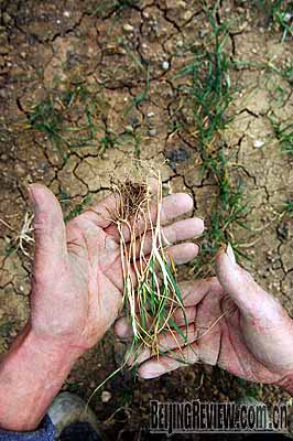 POOR CROPS: A farmer in Baishan Town, Suzhou City, Anhui Province, checks wheat crops in the dry land on February 12 (LI JIAN) | As of February 17, drought-beaten wheat lands in Henan, Hebei, Shanxi, Jiangsu, Shaanxi, Gansu, Anhui and Shandong provinces included 5.04 million hectares, with 1.97 million hectares severely affected. These totals had decreased by 1.45 million hectares and 344,520 hectares, respectively, compared to the previous day thanks to efforts by all levels of government, according to the Ministry of Agriculture.