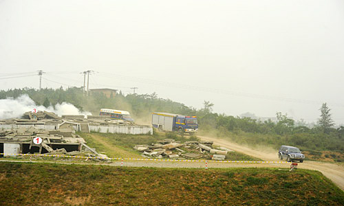 BATTLE BEGINNING: Rescue teams arrive at a simulation earthquake-hit site in time (SHI GANG) |