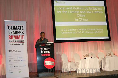 VOICE ON WORLD STAGE: Li Bo of Friends of Nature delivers a speech on December 6 at the China Day event on the sidelines of the UN Climate Change Conference in Cancun, Mexico (COURTESY OF FRIENDS OF NATURE) |