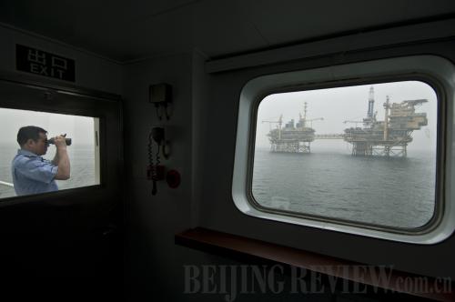 OVERSIGHT: A crewmember of a Chinese maritime surveillance ship observes Platform B of the Penglai 19-3 Oilfield on July 15 (GUO SHELEI) |