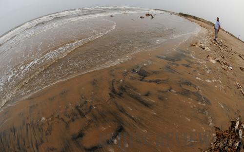 MARINE POLLUTION: The presence of oil, allegedly leaked from the Penglai 19-3 Oilfield, is evident on the beach of Laoting County, Hebei Province, on July 25 (GONG ZHIHONG) |