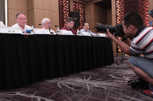 PUBLIC COMMITMENT: Senior executives of ConocoPhillips China attend a press conference in Beijing on August 24, pledging to complete the clean-up of oil spilled into the Bohai Bay before the August 31 deadline (XING GUANGLI) |