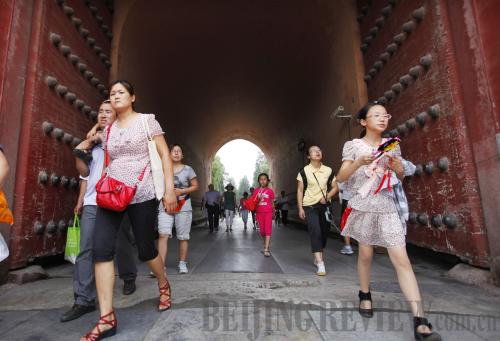 A MUST-SEE SITE: Visitors walk out of the Palace Museum's Donghua Gate on July 20 (WAN XIANG) |