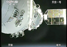 KISSING EACH OTHER: A video grab taken from the China Central Television on November 3 shows the Shenzhou 8 spacecraft docking with the Tiangong-1 space lab module (XINHUA) |