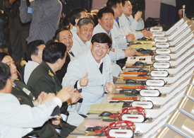 JOB WELL DONE: Staff at the Beijing Aerospace Flight Control Center celebrate with each other after the successful docking of Shenzhou 8 with Tiangong-1 in the early morning on November 3 (XIE HUANCHI) |