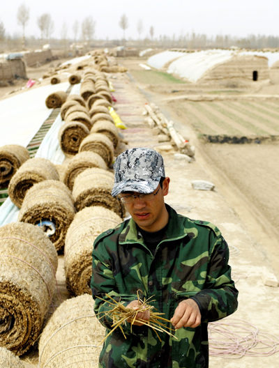 INNOVATIVE MAN: Ge Rongzu, in Nancha Village, Gaotai County in Gansu Province, has invented a new type of wheat-straw curtain for greenhouses (GAO JIANJUN) |