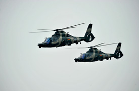 FLIGHT PERFORMANCE: Two Z-9WZ helicopters of the Army Aviation Fourth Helicopter Regiment of the Chinese People's Liberation Army take flight in an aerobatic performance on July 24 at its base in Beijing (SHI GANG) |