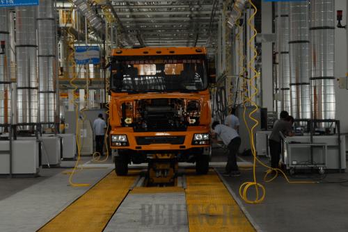 ROLL OUT: Workers assemble a heavy truck in a newly TRADE PORT: A line of trucks newly bought by foreign clients from China wait to clear customs in Horgos Port, bordering Kazakhstan, in Xinjiang Uygur Autonomous Region, on June 10built workshop of Shaanxi Automobile Group Co. Ltd.'s Xinjiang branch in the Urumqi Economic and Technological Development Zone on July 25 (BAI SHI) |
